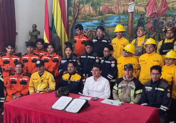 Alcalde de Tarija firma convenio histórico con bomberos voluntarios para fortalecer atención de emergencias.