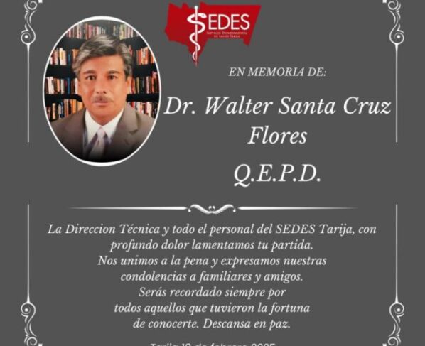 A través del Servicio Departamental de Salud (Sedes) se conoció del fallecimiento de Walter Santa Cruz Flores, destacado médico tarijeño, que desde la década de los 80 se ha batido…