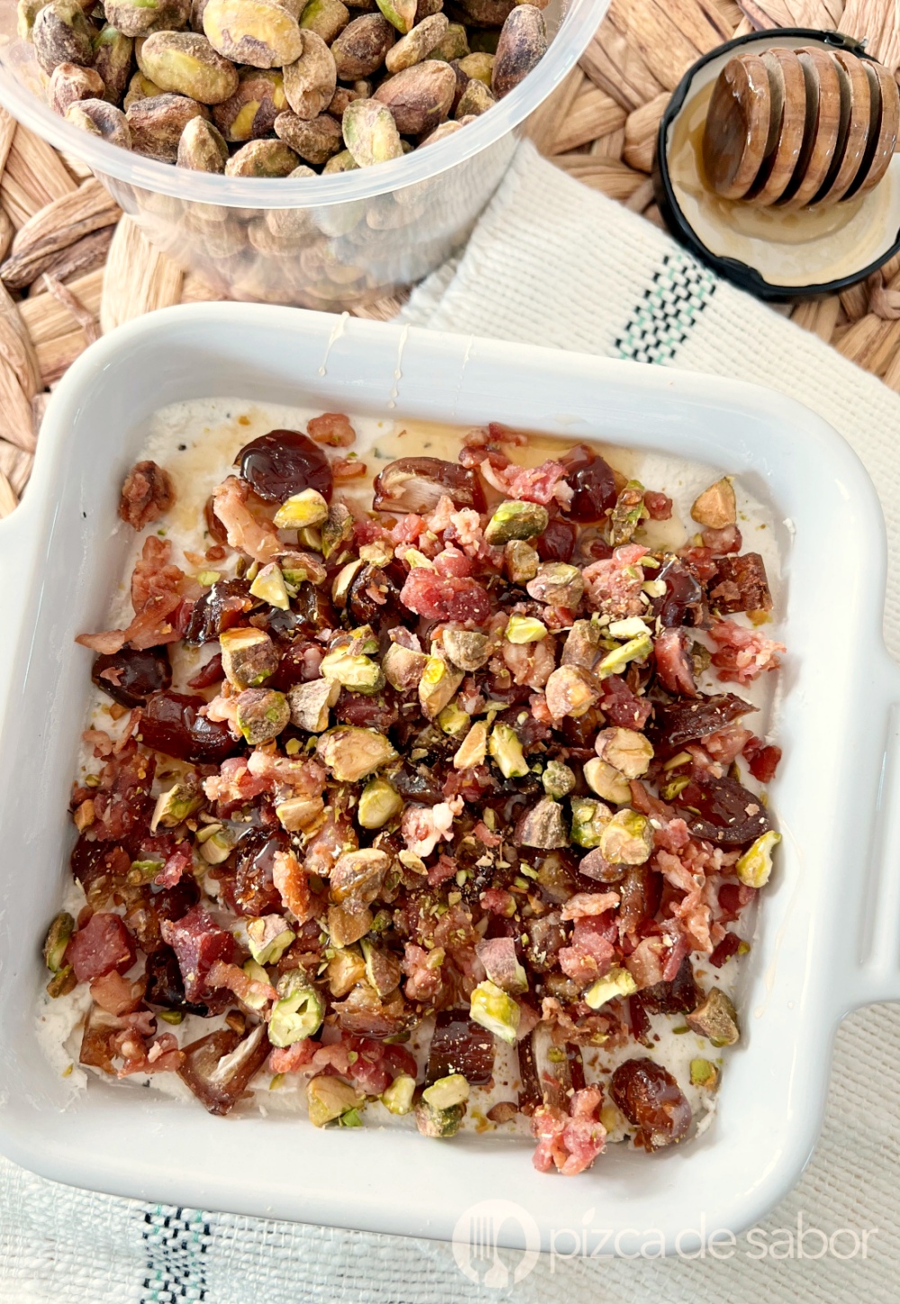 Por último, para darle el toque crujiente, yo usé pistaches que me encanta su sabor y lo saladito, además de que le da un color verde hermoso al platillo final. Si no tienes puedes cambiar por nueces, almendras, nuez de la india o el fruto seco que más se te antoje o tengas en casa.
