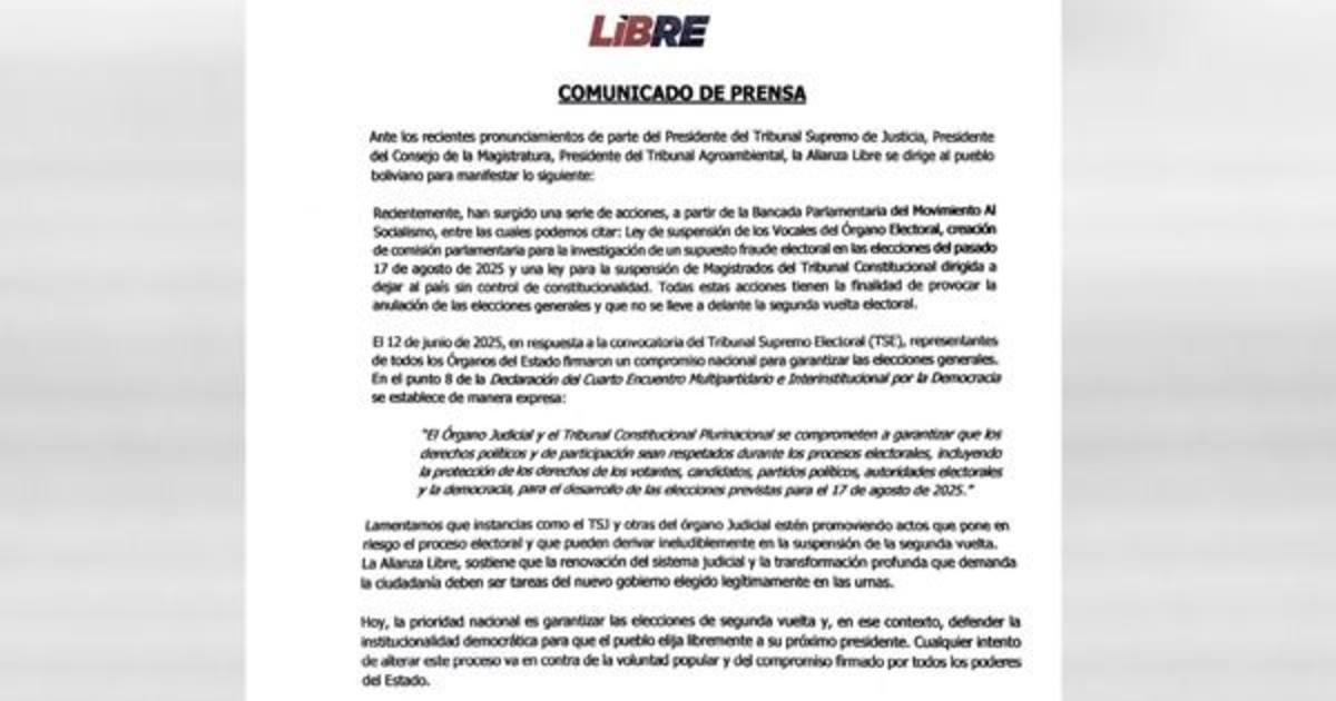 La Alianza Libre, coalición que respalda la candidatura presidencial de Jorge Tuto Quiroga, ha expresado su profunda inquietud ante las recientes declaraciones de altos funcionarios del sistema judicial. La agrupación política ha criticado los pronunciamientos de Rómer Saucedo, presidente del Tribunal Supremo de Justicia; Manuel Baptista, presidente del Consejo de la Magistratura; y Richard Méndez, presidente del Tribunal Agroambiental, dirigidos contra magistrados que han extendido sus propios mandatos. A juicio de la Alianza Libre, estas acciones comprometen la estabilidad del proceso electoral y podrían culminar en la suspensión de la segunda vuelta.