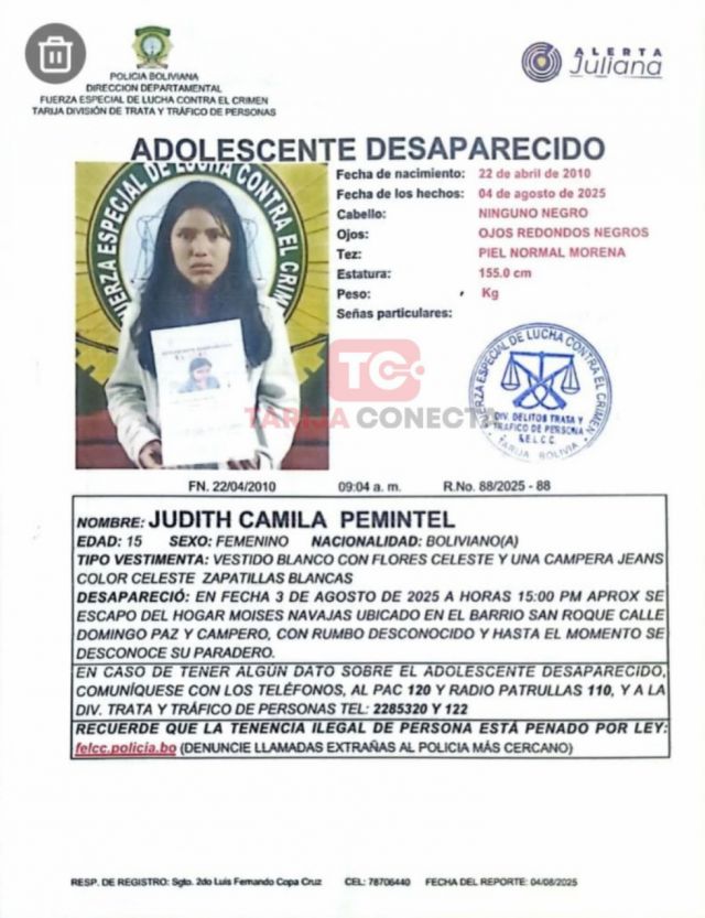 La Dirección Departamental de Lucha Contra el Crimen (DDLC) de Tarija ha iniciado una operación de búsqueda para localizar a Judith Camila Pemintel, una adolescente de quince años. Según la información disponible, la joven se habría ausentado del hogar Moíses Navajas. Las autoridades policiales hacen un llamado a la colaboración ciudadana, solicitando que cualquier persona con información relevante sobre su paradero se comunique de inmediato con la policía