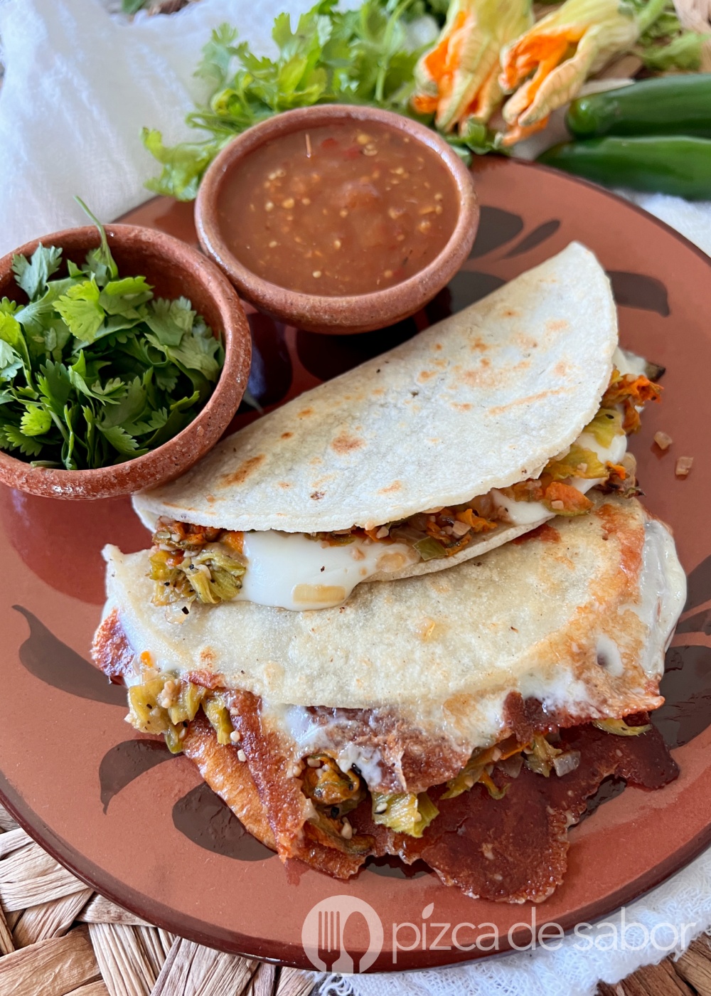 También una crema de flor de calabaza donde dejamos que brille y sea la estrella de sabor. Tengo una sopa de flor de calabaza con elote que acabo de grabar cuando cociné estas quesadillas y te la comparto pronto por aquí.